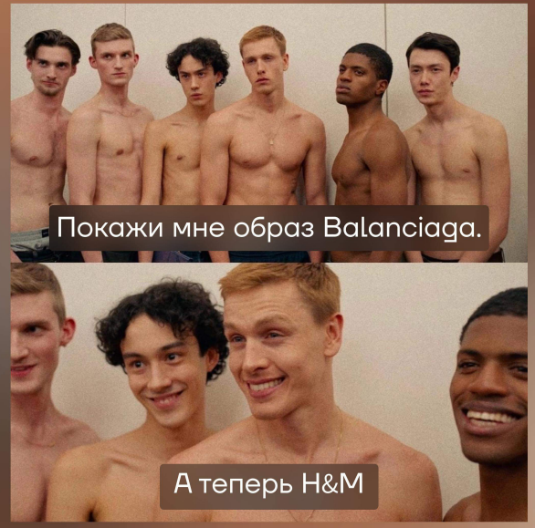 Об этом — мем из фильма «Треугольник печали», когда модели для фотографа показывают то дорогой бренд — с холодным и высокомерным лицом, то бюджетный — дружелюбно и радостно.