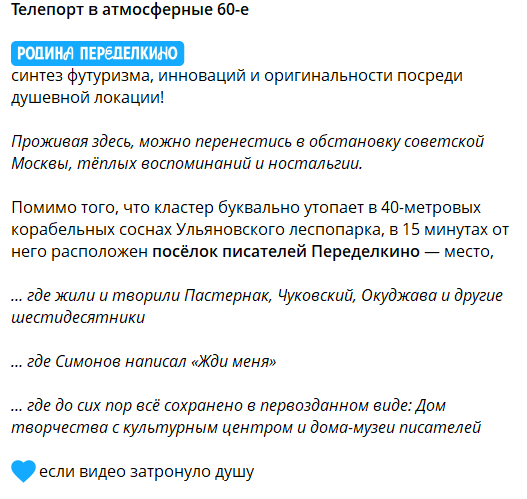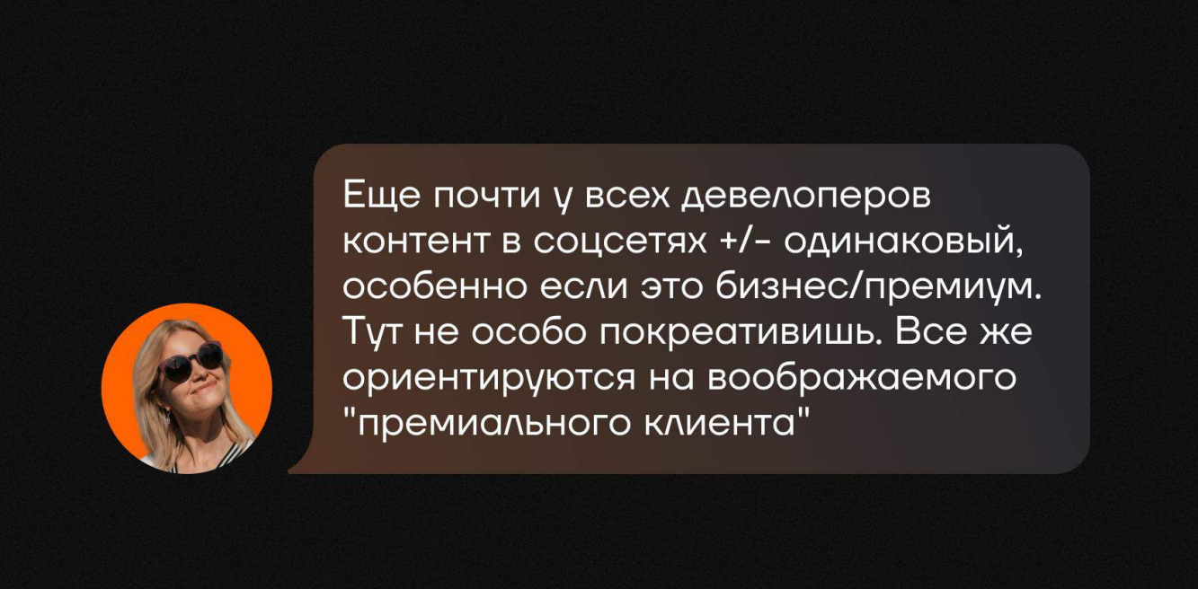 В соцсетях это выражается в особенном стиле текстов и выборе тем: заказчик становится осторожным и сдержанным, и поэтому телеграм-каналы премиального жилья становятся очень похожи, ограниченные «разрешенными» оборотами и темами.