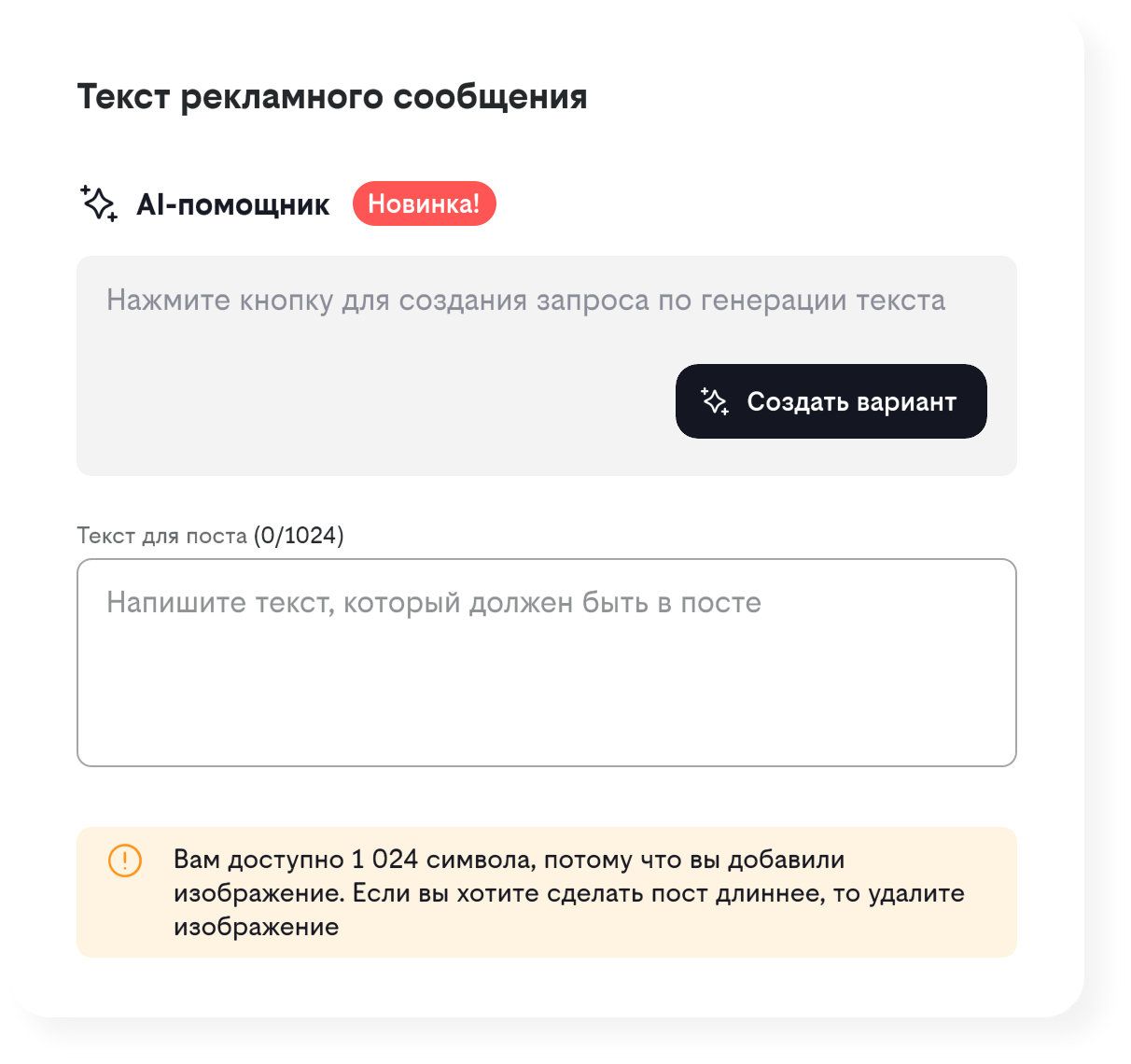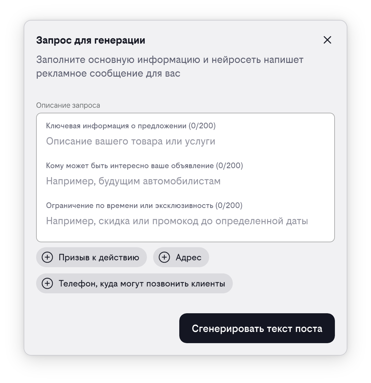 Для того чтобы создать креативный текст, достаточно заполнить поле на платформе Билайн.ПРОдвижение. ИИ-помощник предложит вариант поста, который можно использовать без изменений или отредактировать. Содержание текста клиенту также необходимо проверить на соответствие требованиям законодательства.