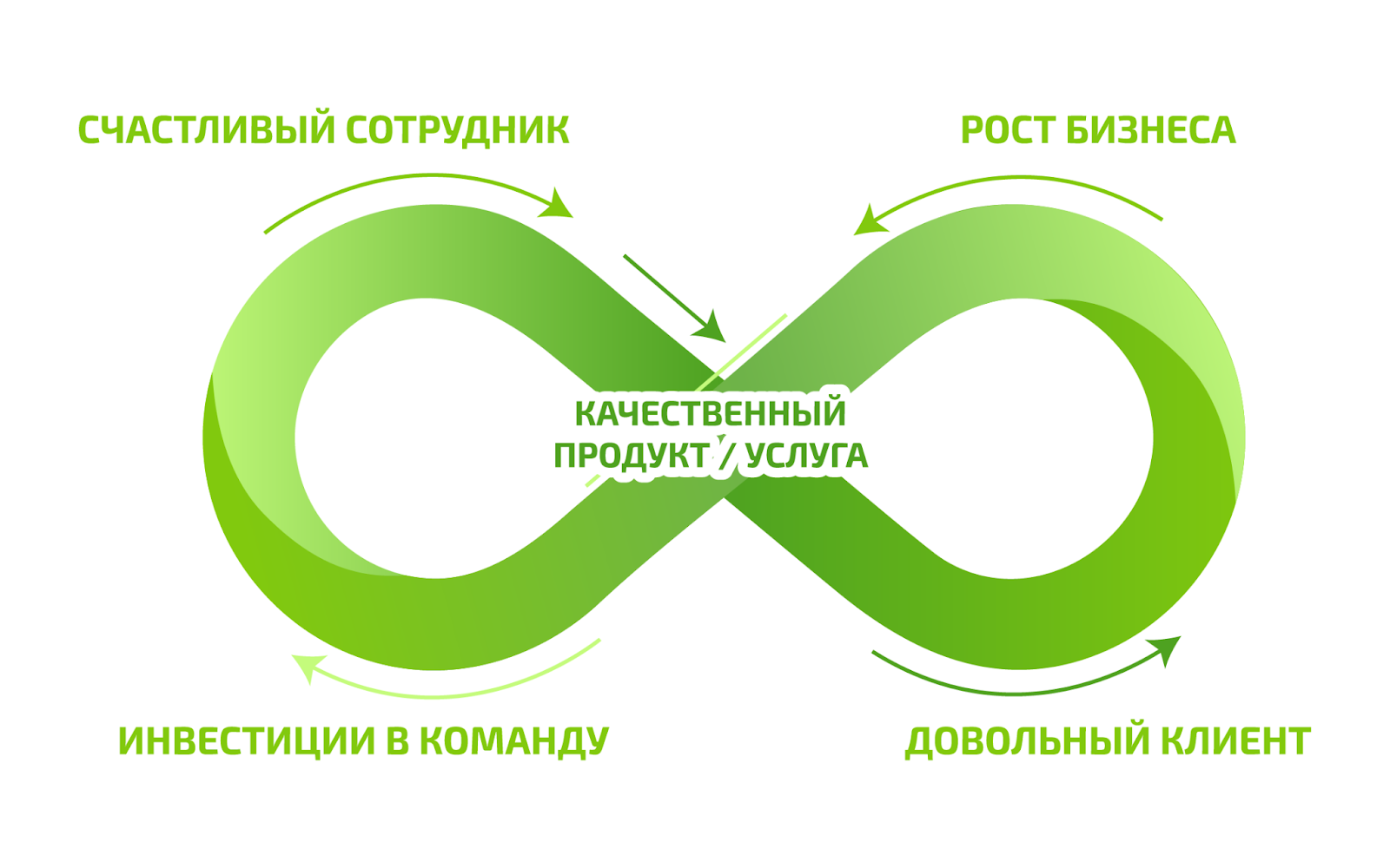 Счастливый сотрудник создает качественный продукт, довольный клиент осуществляет повторные покупки, а это растит бизнес — и круг замыкается, открывая новые возможности для компании.