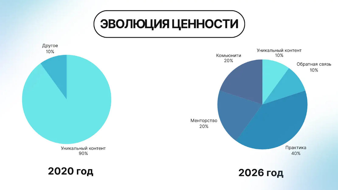 Во-первых, выход практической составляющей на первый план. Теория становится бесплатным приложением, а деньги платят за практику, обратную связь и внедрение навыков.