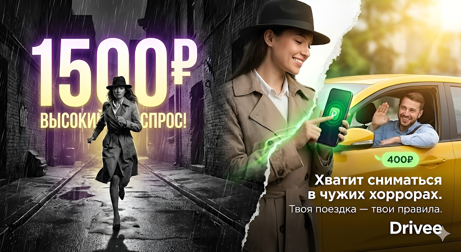 Начало (конфликт): стилистика старого черно-белого хоррора. Девушка бежит под дождем от надвигающихся на нее гигантских цифр «1500 ₽» и «Высокий спрос!», которые светятся тревожным фиолетовым и желтым светом. Звучит нагнетающая музыка. Кульминация: девушка загоняется в тупик. Цифры нависают. Она достает смартфон, который светится спасительным зеленым цветом. Открывает Drivee. Развязка: девушка свайпает по экрану, и реальность вокруг начинает меняться, как будто перематывают VHS-кассету. Черно-белый нуар сменяется ярким солнечным днем. Страшные цифры превращаются в приветливого водителя на желтой (в смысле солнечной!) машине. Девушка сама вводит «400 ₽», водитель кивает. Она садится, звучит расслабленный лоу-фай бит. Текст на экране: «Хватит сниматься в чужих хоррорах. Твоя поездка — твои правила. Drivee».