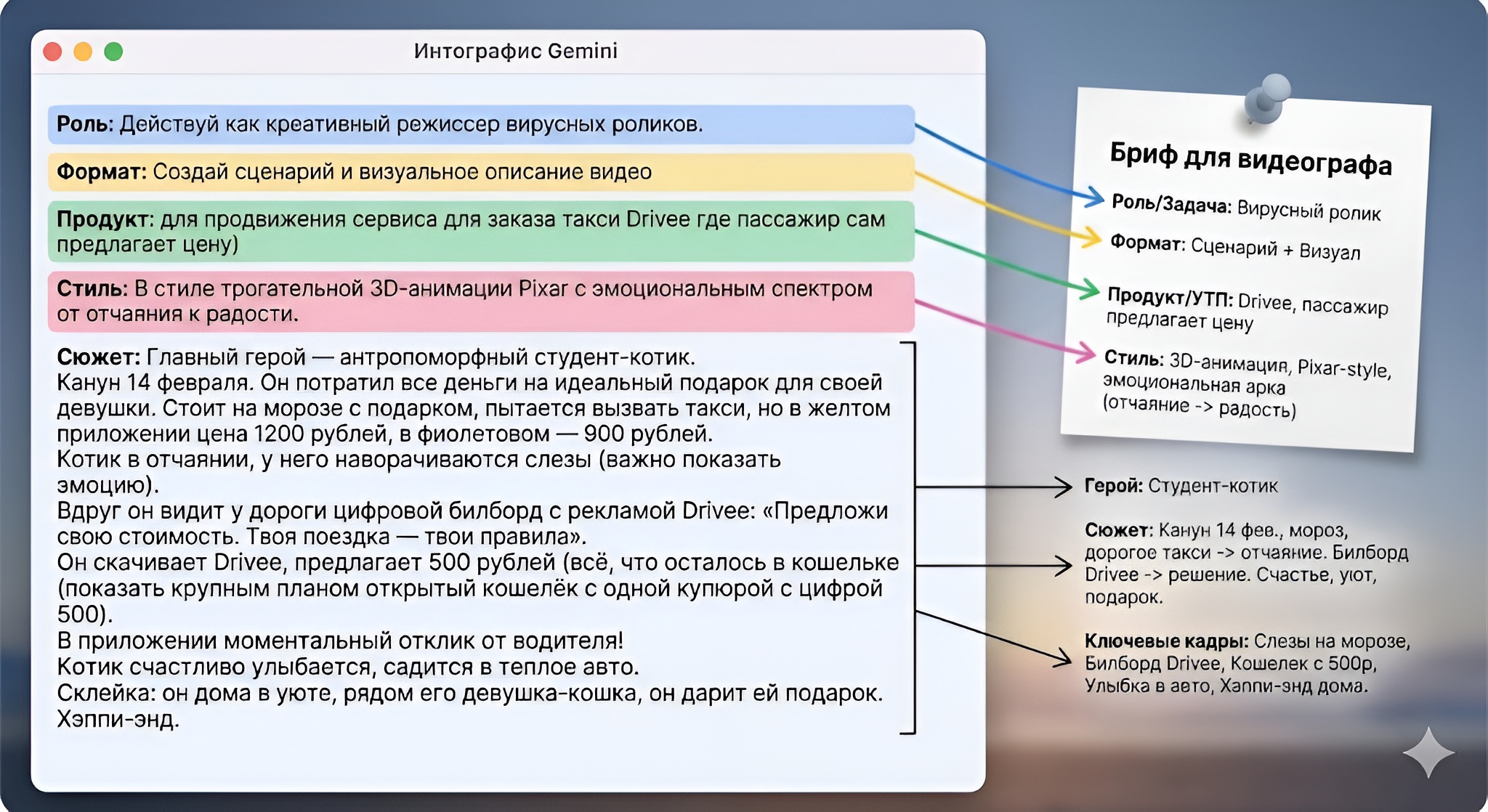 Вот как это выглядит на практике для Drivee. Промпт для генерации видео (Студент-котик на 14 февраля):