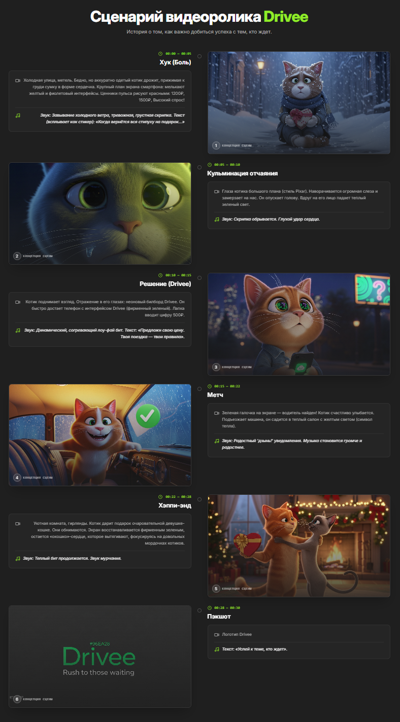 - Сюжет: главный герой — антропоморфный студент-котик. Канун 14 февраля. Он потратил все деньги на идеальный подарок для своей девушки. Стоит на морозе с подарком, пытается вызвать такси, но в желтом приложении цена 1200 рублей, в фиолетовом — 900 рублей. Котик в отчаянии, у него наворачиваются слезы (важно показать эмоцию). Вдруг он видит у дороги цифровой билборд с рекламой Drivee: «Предложи свою стоимость. Твоя поездка — твои правила». Он скачивает Drivee, предлагает 500 рублей (все, что осталось в кошельке (показать крупным планом открытый кошелек с одной купюрой с цифрой 500). В приложении моментальный отклик от водителя! Котик счастливо улыбается, садится в теплое авто. Склейка: он дома в уюте, рядом его девушка-кошка, он дарит ей подарок. Хэппи-энд.