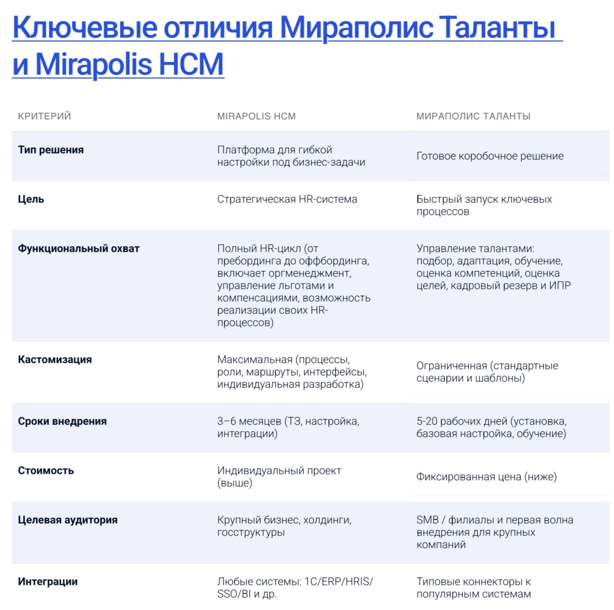 - Мираполис Таланты — полнофункциональное коробочное решение, которое закрывает все базовые HR-процессы и может быть самодостаточным для многих компаний. При этом оно построено на той же платформе, что позволяет при необходимости масштабироваться до Mirapolis HCM без перезапуска проекта.