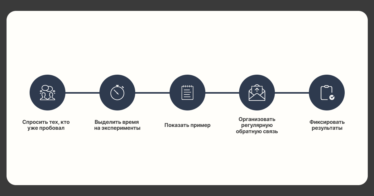 - Покажите пример. Если руководитель сам использует ИИ и открыто делится опытом — это снижает барьер и убирает страх «ошибиться».
