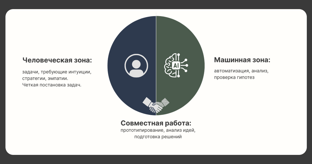 Это не про замену людей, а про распределение ролей. Человек решает, что делать, а ИИ помогает — предлагает черновики, анализирует данные, предупреждает о рисках.