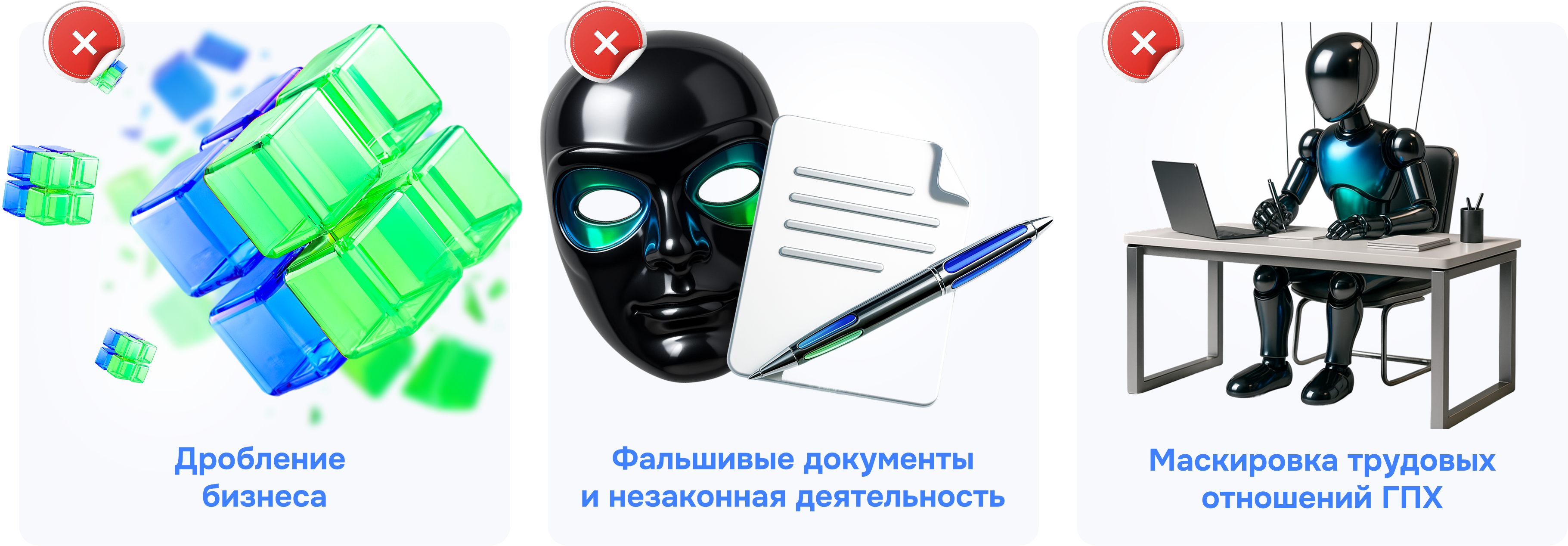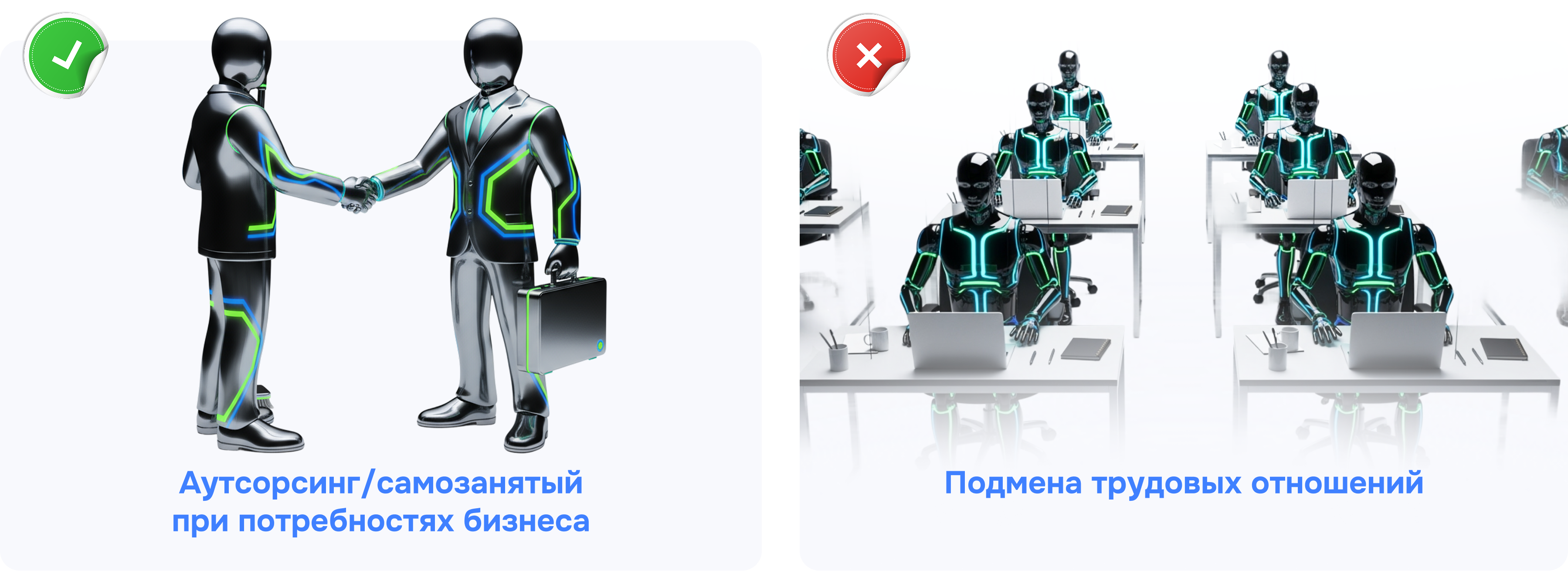Использование аутсорсинга и самозанятых позволяет снизить нагрузку на фонд оплаты труда и избежать обязательных взносов. Однако важно помнить, что работа с самозанятыми требует внимательности к оформлению отношений, чтобы не нарушить законодательство и не столкнуться с переквалификацией договора в трудовой.