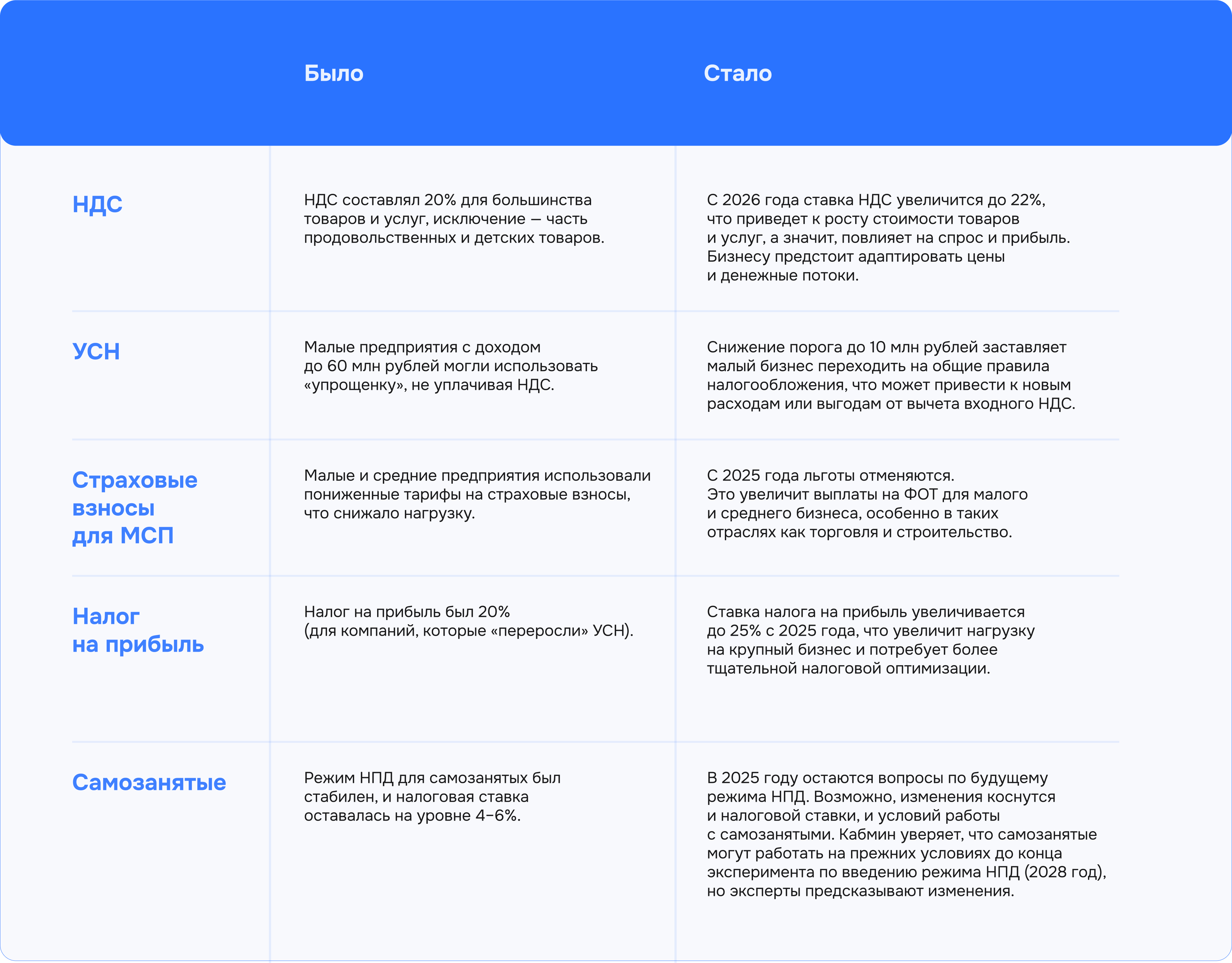 2025 год начался с глобальной налоговой реформы, и похоже, что это не последняя налоговая новость этого года. От повышения НДС до предсказуемых изменений в режиме самозанятости, изменения постепенно врезаются в бюджет и финансовые потоки всех компаний. Что же изменится для предпринимателей в 2026, какие новые ставки налогов и взносов будут актуальны, и как все это скажется на бизнесе?