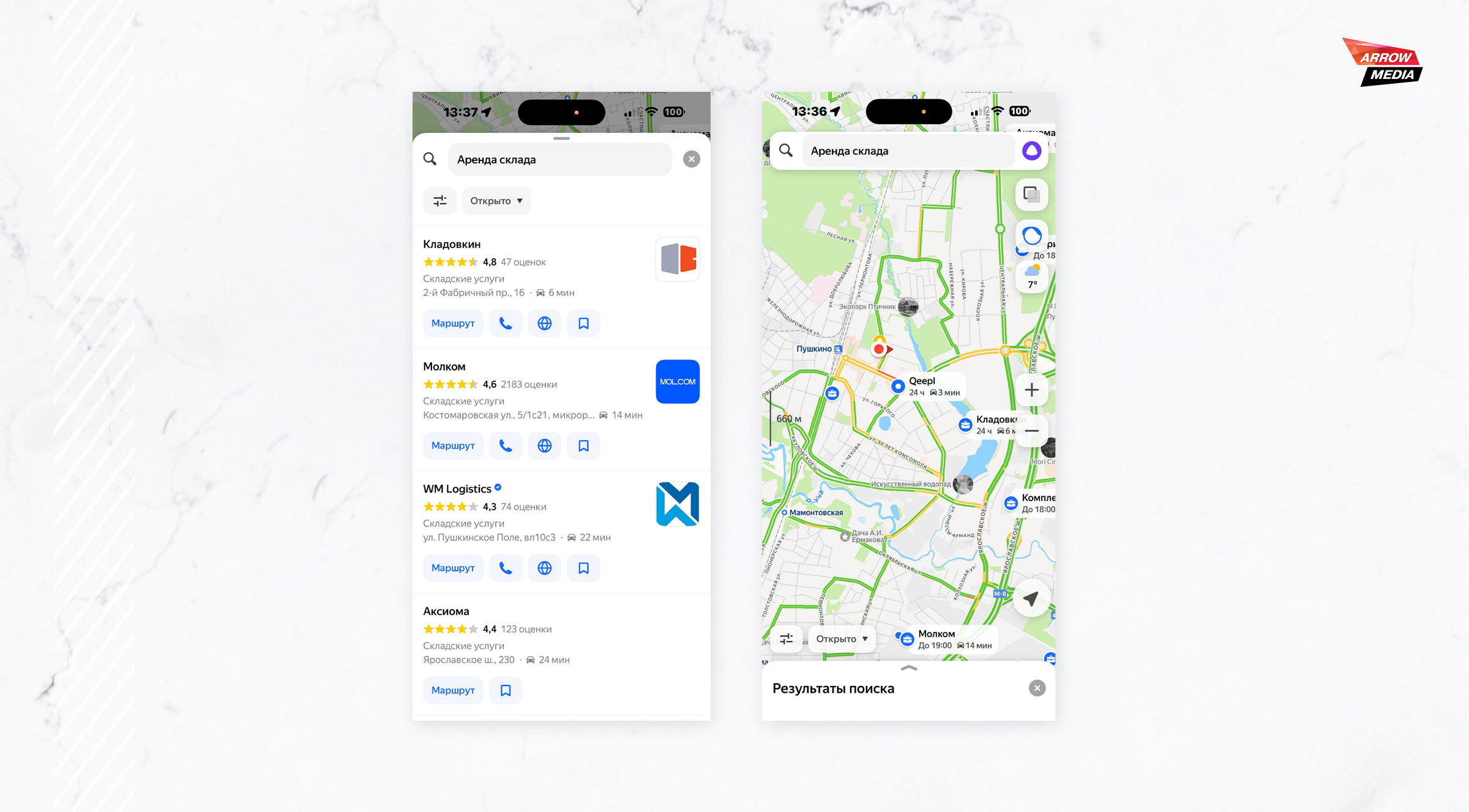 Раньше пользователь вводил запрос в Яндекс Картах и самостоятельно анализировал список организаций. Сейчас он фактически делегирует выбор системе: алгоритм оценивает историю поведения и контекст, в котором находится человек. Например, при запросе «аренда склада» с мобильного устройства сервис сначала показывает ближайшие варианты, поскольку в мобильном сценарии предполагается, что нужно быстро оценить доступные объекты поблизости.