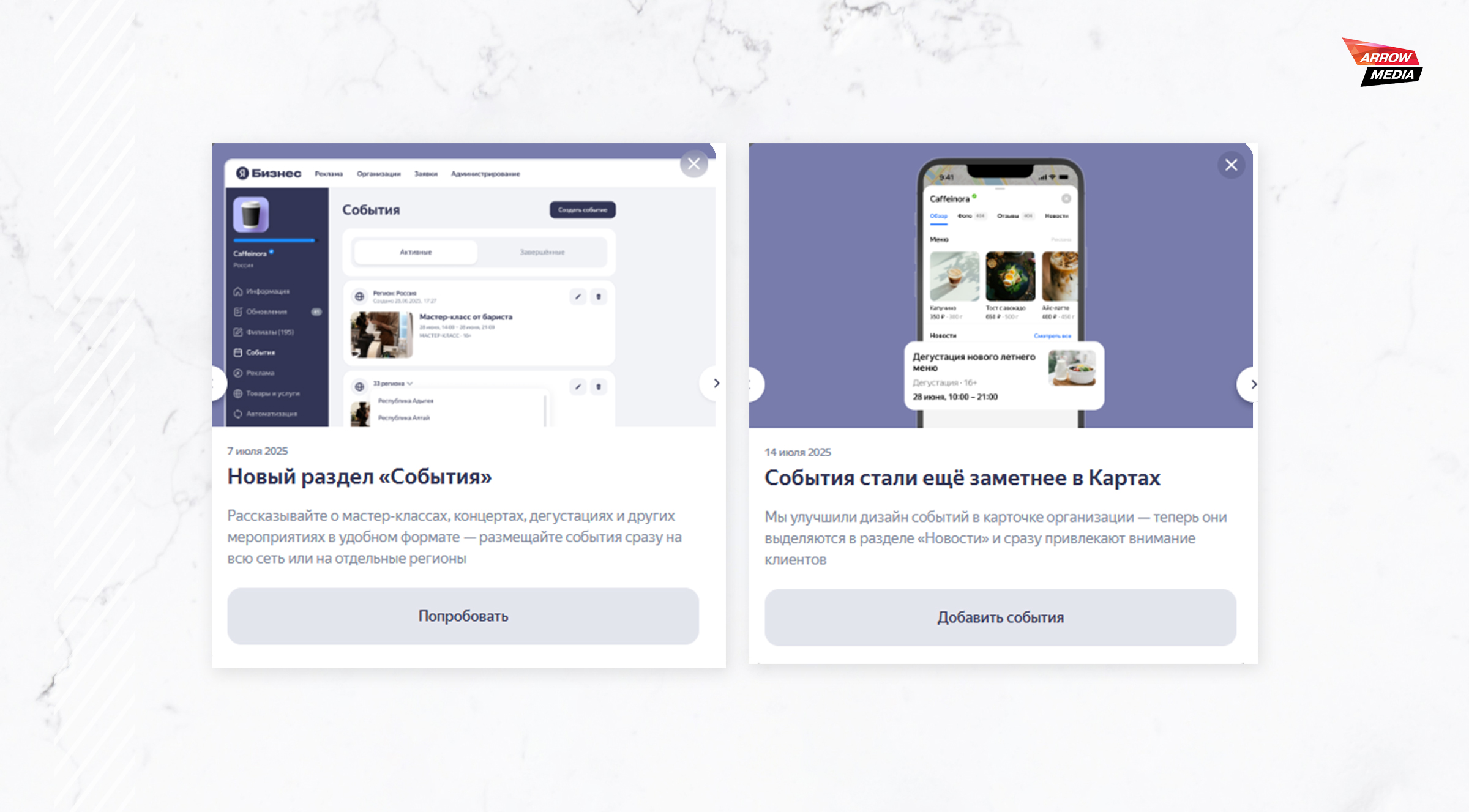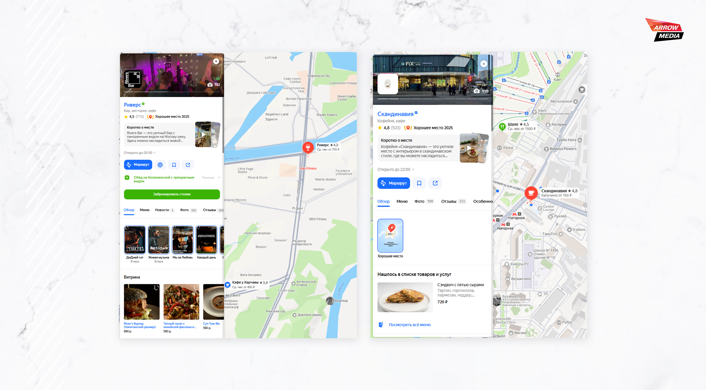В геосервисах продвижение строится вокруг поисковых запросов. Приоритетное размещение выводит карточку компании на уровень с конкурентами-рекламодателями в нужной рубрике и открывает доступ к дополнительным блокам — витрина, акции, спецпредложения. Разница между рекламной и обычной карточкой заметна сразу: по оформлению, видимости и позициям в результатах выдачи.