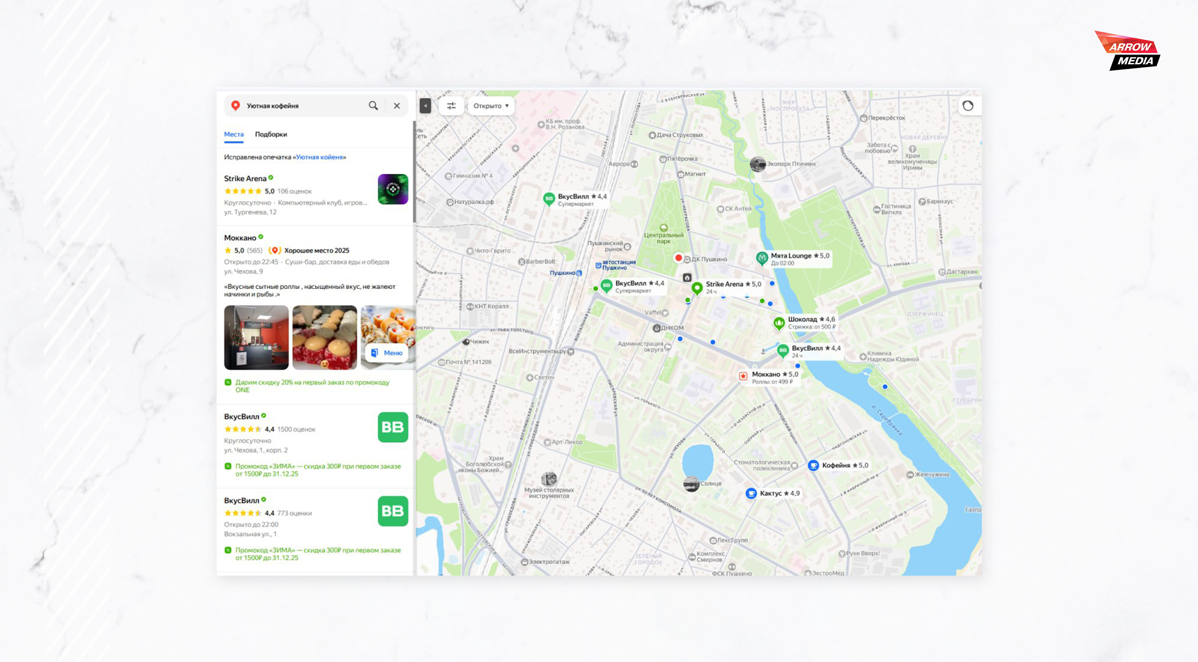 Локальный поиск вышел за рамки навигации и стал рекомендательной системой, учитывающей поведение пользователя. Выдача формируется персонально и меняется в зависимости от десятков факторов — от формулировки запроса до поведения похожей аудитории. Чтобы оставаться видимыми, компаниям необходим комплексный подход: усиление SEO внутри Карт, регулярное обновление контента и геореклама, которая выводит карточку в топ выдачи в момент выбора.
