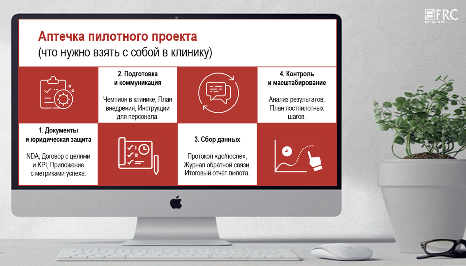 Наиболее удачные пилоты проходят там, где есть «чемпион» — врач, администратор или ИТ-специалист, заинтересованный в решении вашей проблемы. Он поможет внедрить продукт, объяснить коллегам, зачем он нужен, и удержать внимание команды до конца тестирования.