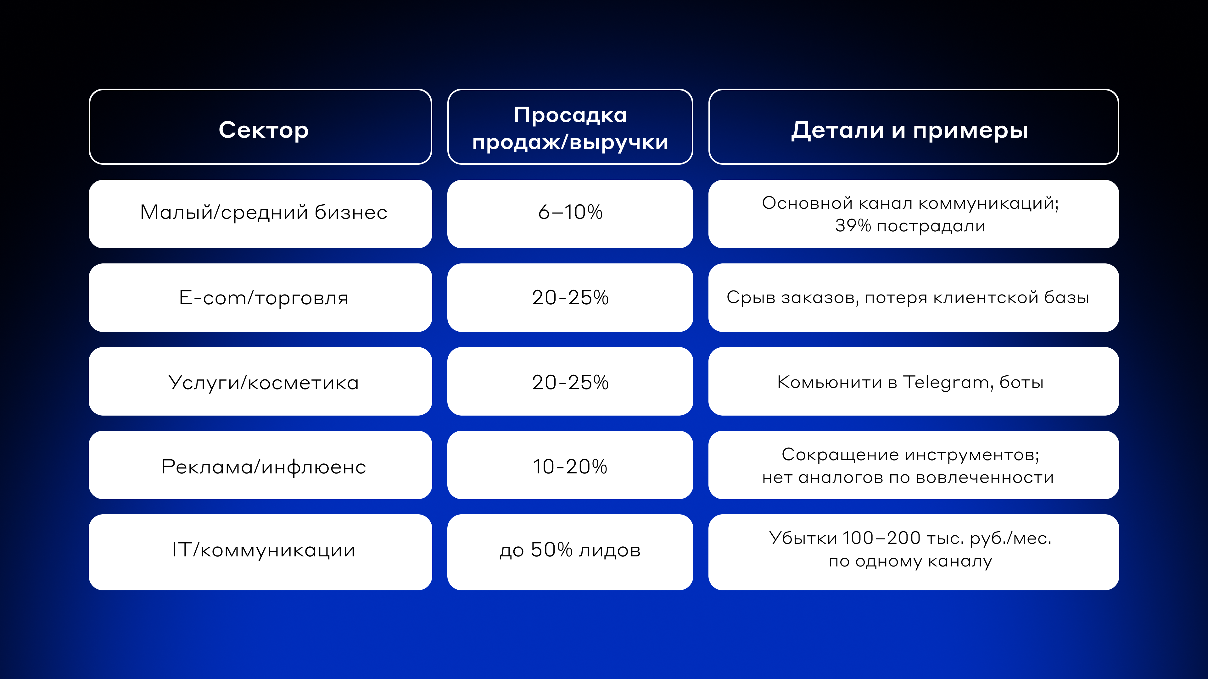 Теперь ситуация обстоит иначе. По данным из открытых источников, от 6 до 20% выручки теряют бизнесы в разных нишах с тех пор, как мессенджеры перестали работать стабильно. Подробные данные представлены в таблице.