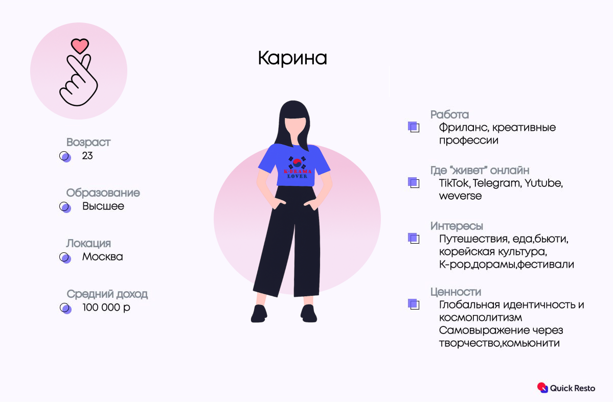 В качестве примера мы создали аватар типичной гостьи московского заведения корейской кухни — Карины. Понимание ее портрета позволяет определить преимущественные каналы и коммуникацию: от ToV до конкретных офферов и форматов.