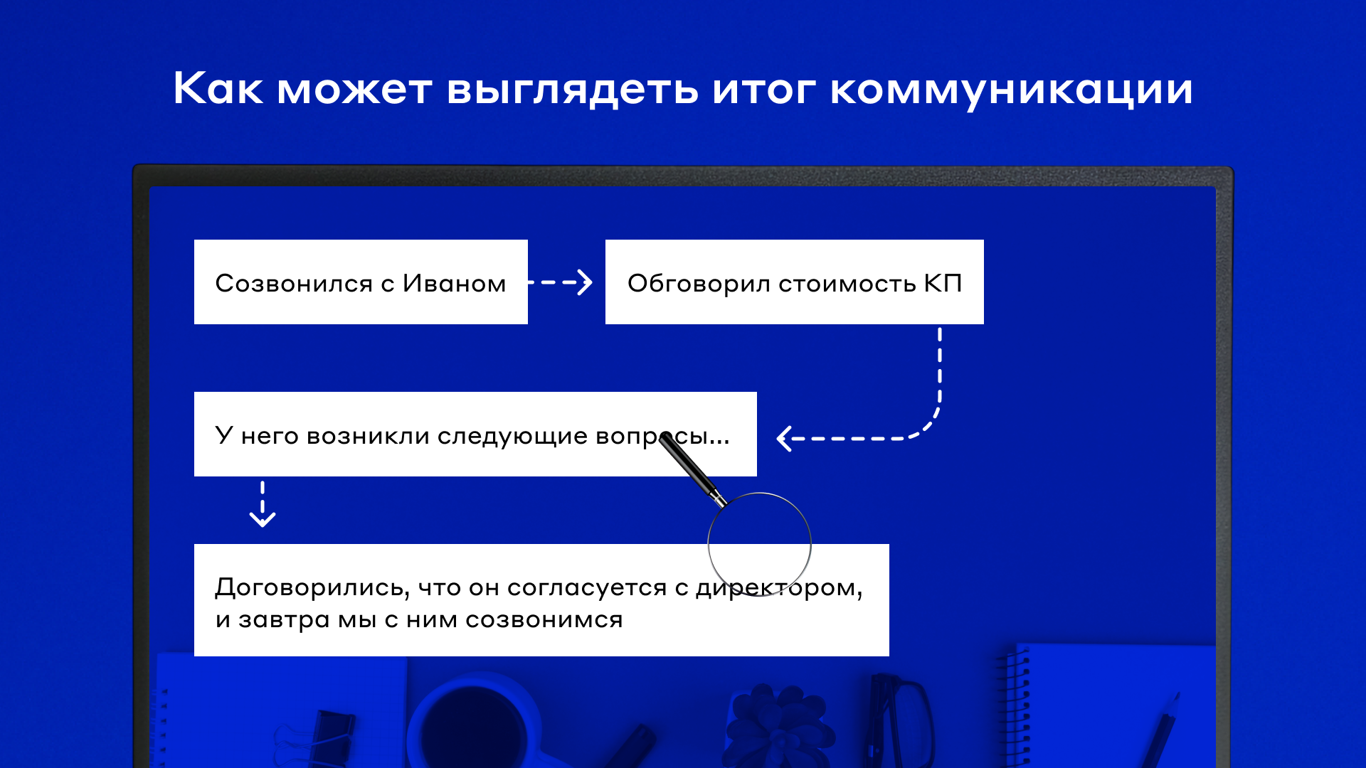 При долгих циклах сделки менеджер может не помнить, о чем договаривался с клиентом 3 месяца назад.