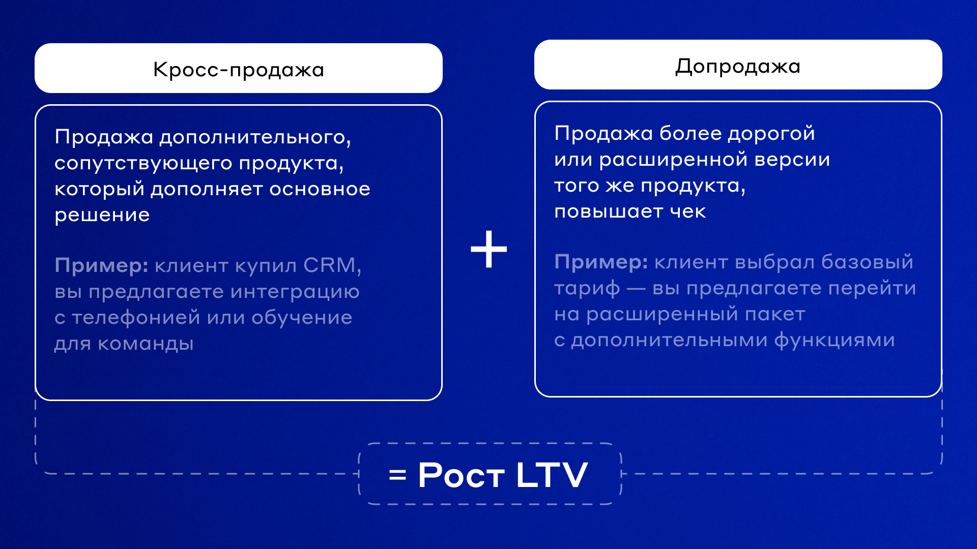 Для улучшения показателя LTV необходимо выстраивать процесс допродаж и кросс-продаж. Предлагая дополнительные, но релевантные продукты, вы побуждаете клиента приобрести больше услуг за раз. А делая повторные предложения после покупки, вы увеличиваете его средний чек. Тем самым прибыль с клиента за цикл жизни «перекрывает» затраты на его привлечение.