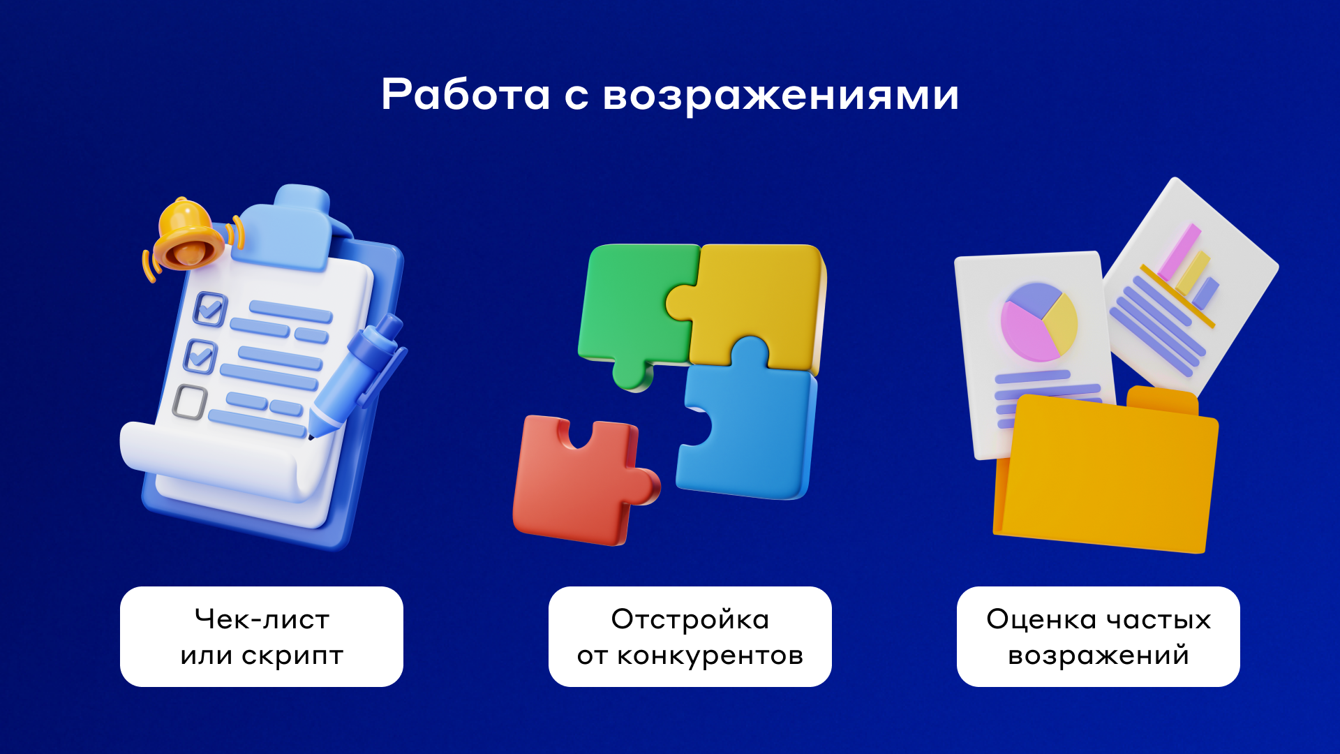 - Возражения от сделки к сделке будут повторяться. Сформируйте для вашего отдела продаж чек-лист или скрипт, но не усложняйте процесс: пусть сотрудник использует скрипты для понимания структуры диалога, а выстраивает его самостоятельно.