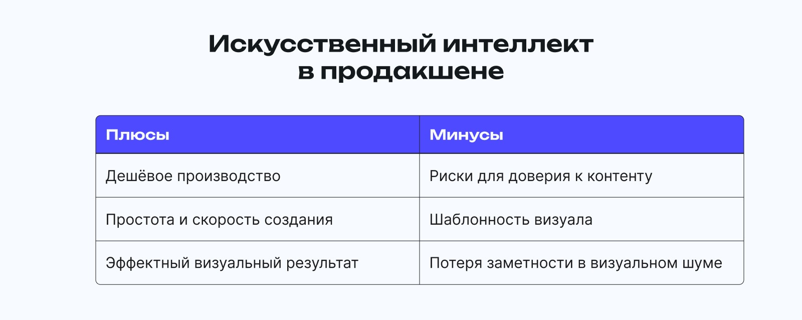 - Громкие визуальные приемы не работают сами по себе. Насыщенные цвета, крупные объекты и эффекты, особенно при массовом использовании AI, быстро теряют эффект и могут вызвать недоверие аудитории.
