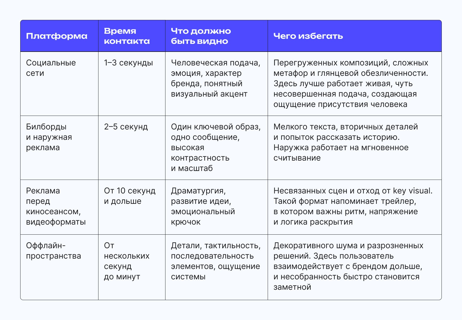 Применение этих принципов на практике требует учитывать специфику каждой платформы и сценарии взаимодействия аудитории с контентом. В таблице ниже показано, как key visual и визуальная стратегия адаптируются под разные каналы: сколько времени пользователь контактирует с контентом, какие элементы должны быть видны и чего лучше избегать.
