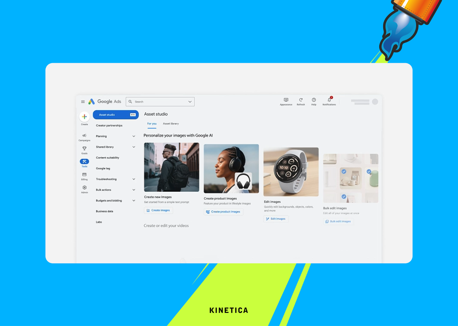 - Инструмент Asset Studio (встроенная AI-мастерская): теперь рекламодатель может создавать и масштабировать рекламные активы (заголовки, изображения, descriptions) прямо в интерфейсе Google Ads. Генеративный ИИ обучен на исторических данных по вашей категории, что позволяет создавать креативы, приближенные к топ-решениям рынка.