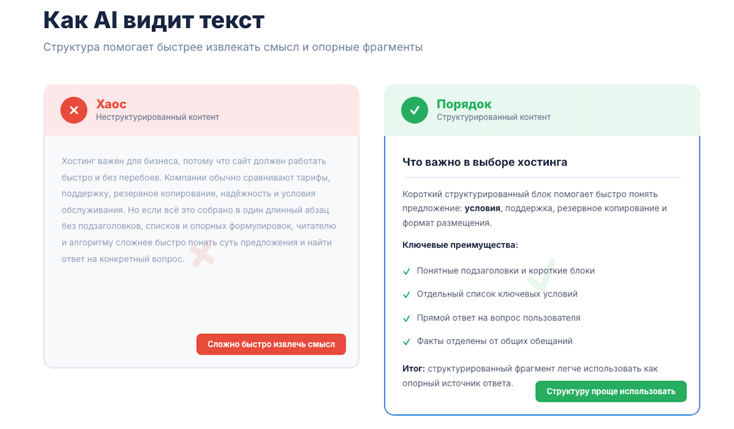 Это не требование к красоте текста. Это техническое требование к машиночитаемости. Структурированный контент обычно легче интерпретировать и людям, и AI-системам.