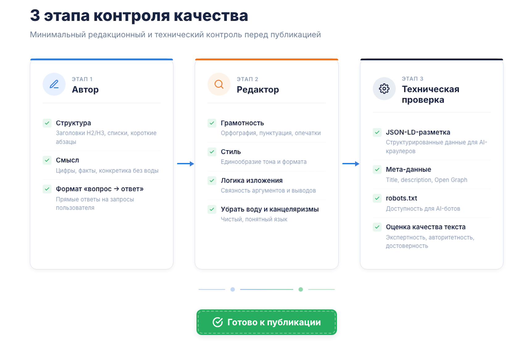 - Этап 1. Автор. Проверяет структуру (заголовки, списки, абзацы), смысл (цифры, факты, конкретика) и соответствие формату «вопрос → ответ».