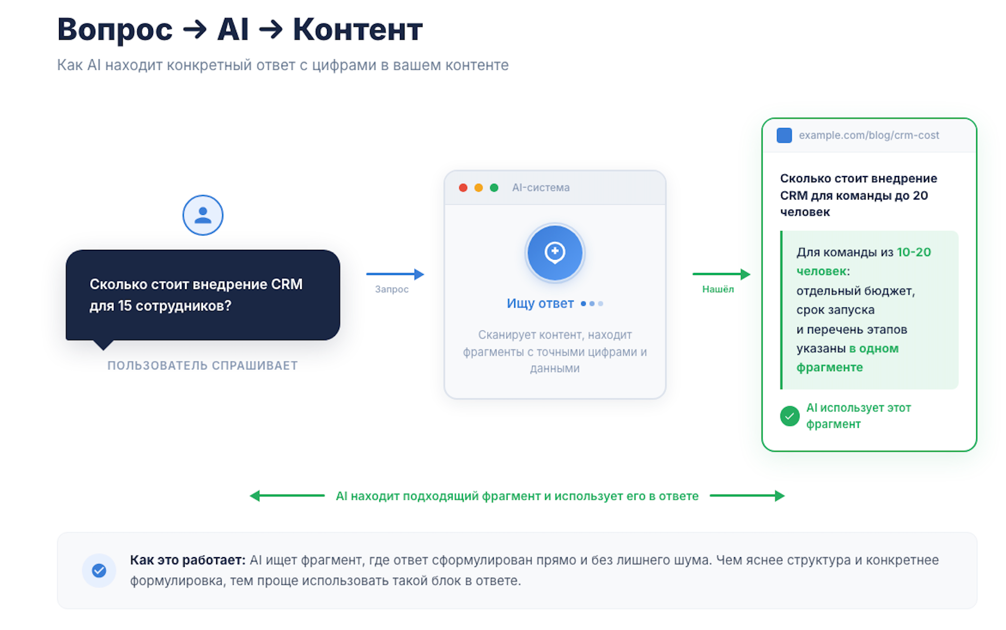 Это работает так. Человек спрашивает у AI: «Сколько стоит внедрение CRM для компании из 15 сотрудников?». Нейросеть ищет страницу, где прямо написано: «Для компании из 10–20 сотрудников внедрение стоит от X рублей, занимает Y дней, включает Z». Если такой ответ есть — AI цитирует его. Если нет — цитирует конкурента.