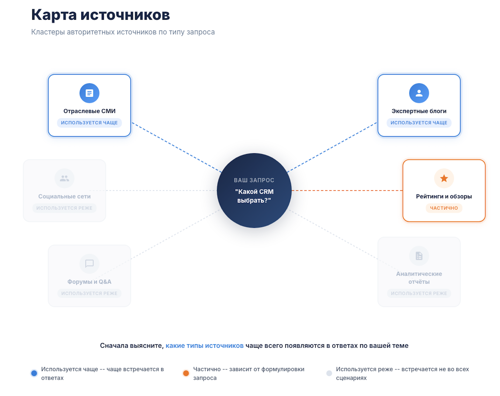 AI-поиск не генерирует ответы из воздуха. Он формирует рекомендации на основе источников, которым доверяет. И для каждого типа запросов набор этих источников свой. Запросы про технологии опираются на одни площадки, про финансы — на другие, про B2B-услуги — на третьи.