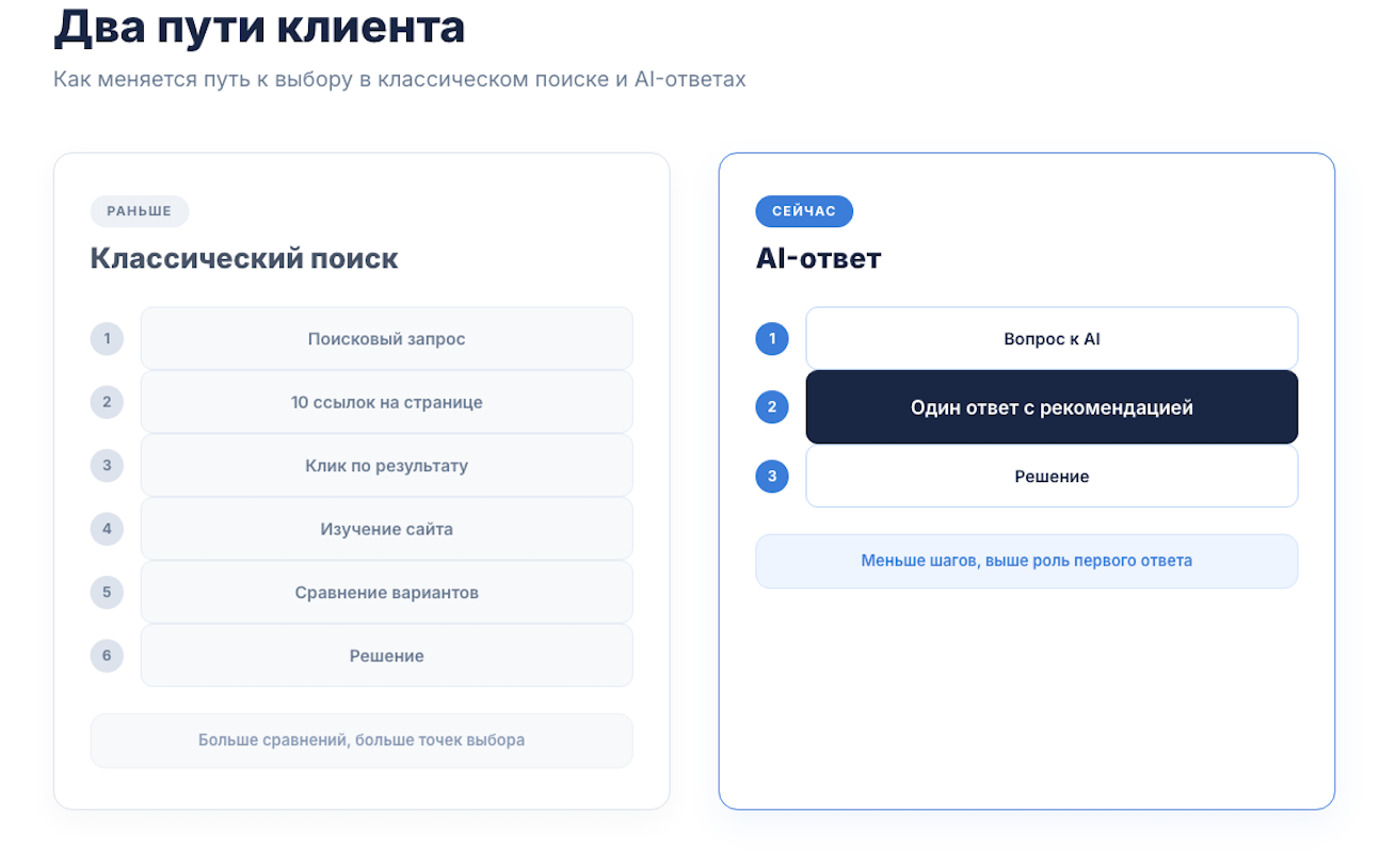 В 2026 году этот путь все чаще выглядит иначе. Клиент спрашивает у ChatGPT, Алисы или Perplexity: «Какой CRM выбрать для малого бизнеса?» или «Где надежнее заказать хостинг?». Получает один структурированный ответ — с конкретными рекомендациями. Никаких десяти ссылок. Один ответ, где кто-то упомянут первым, кто-то — в конце списка, а большинство — не упомянуто вовсе.