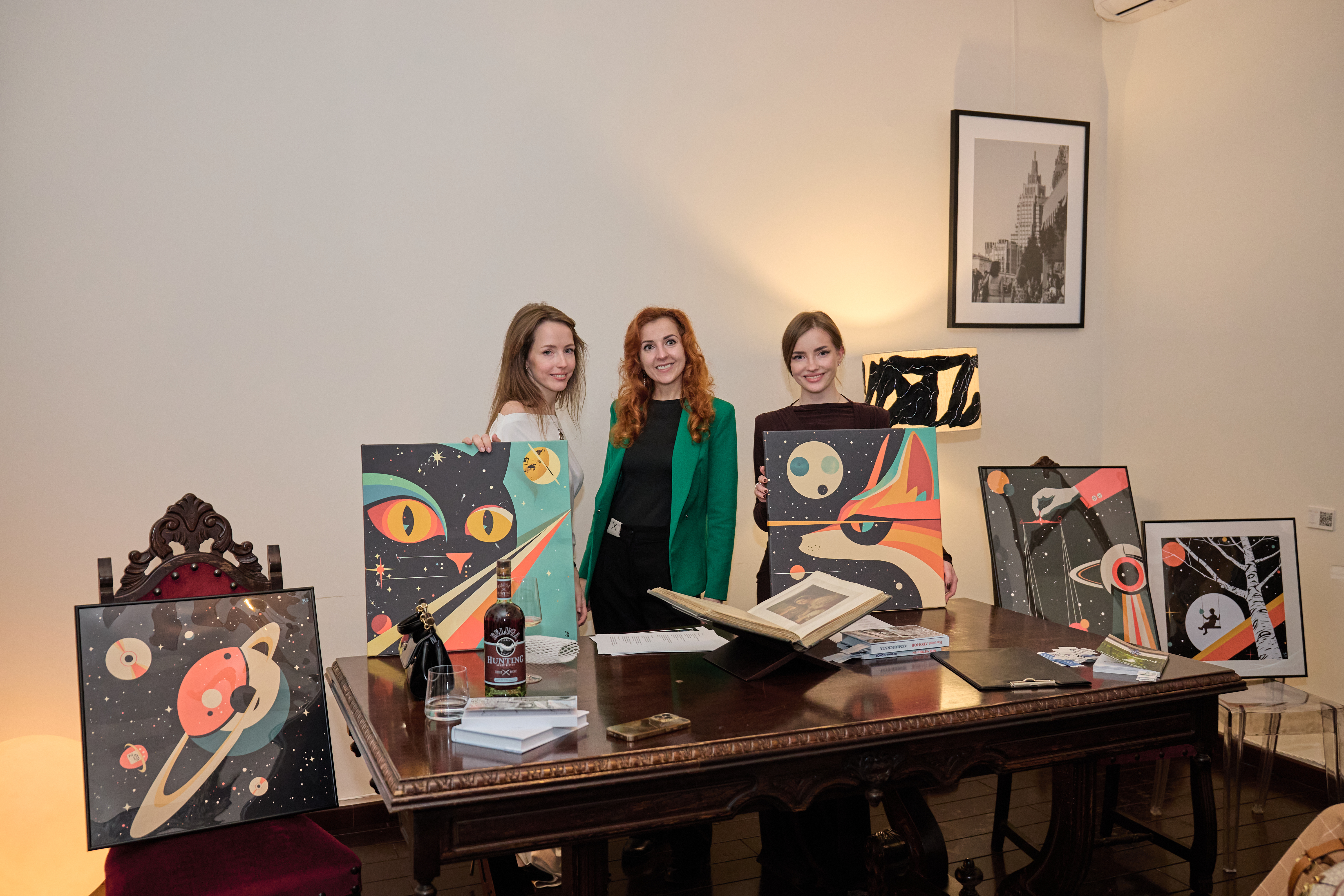 На фото — художница и партнер вечера Екатерина Рыжикова дарит нам с сестрой свои картины и устраивает аукцион последней