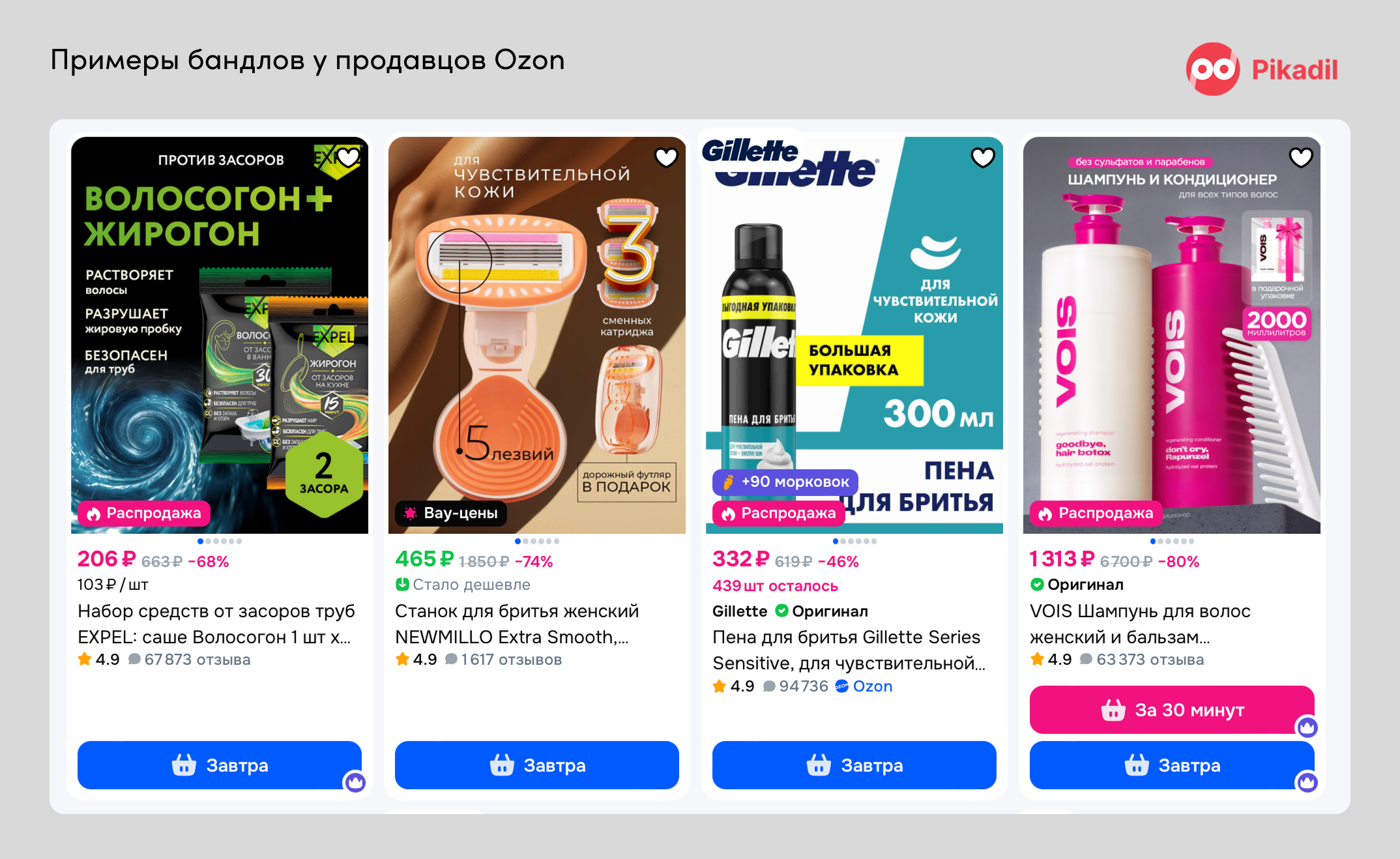 Аналитика Pikadil.ru показывает, что в категориях косметики, парфюмерии и товаров для дома наборы продаются значительно лучше одиночных позиций. Людям проще выбрать готовое решение, чем мучительно подбирать сочетания самостоятельно.