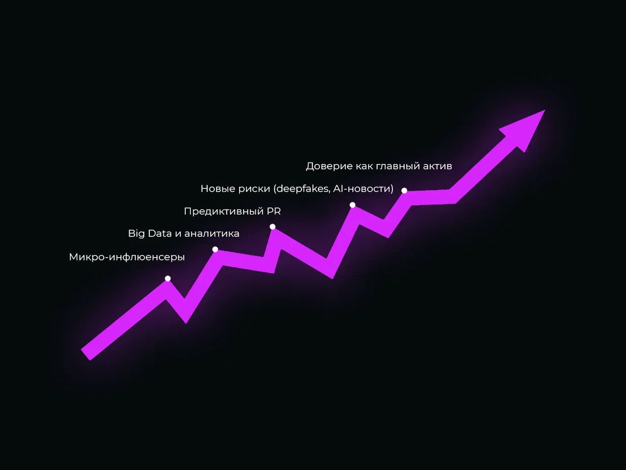 Предиктивный PR и аналитика помогают понимать, какие темы и каналы сработают лучше, а AI ускоряет мониторинг упоминаний и подготовку черновиков. Но стратегические решения, кризисные коммуникации и доверие остаются за людьми. Пресс-служба будущего сочетает технологии и человеческий фактор, формируя повестку и поддерживая экспертный голос бренда.