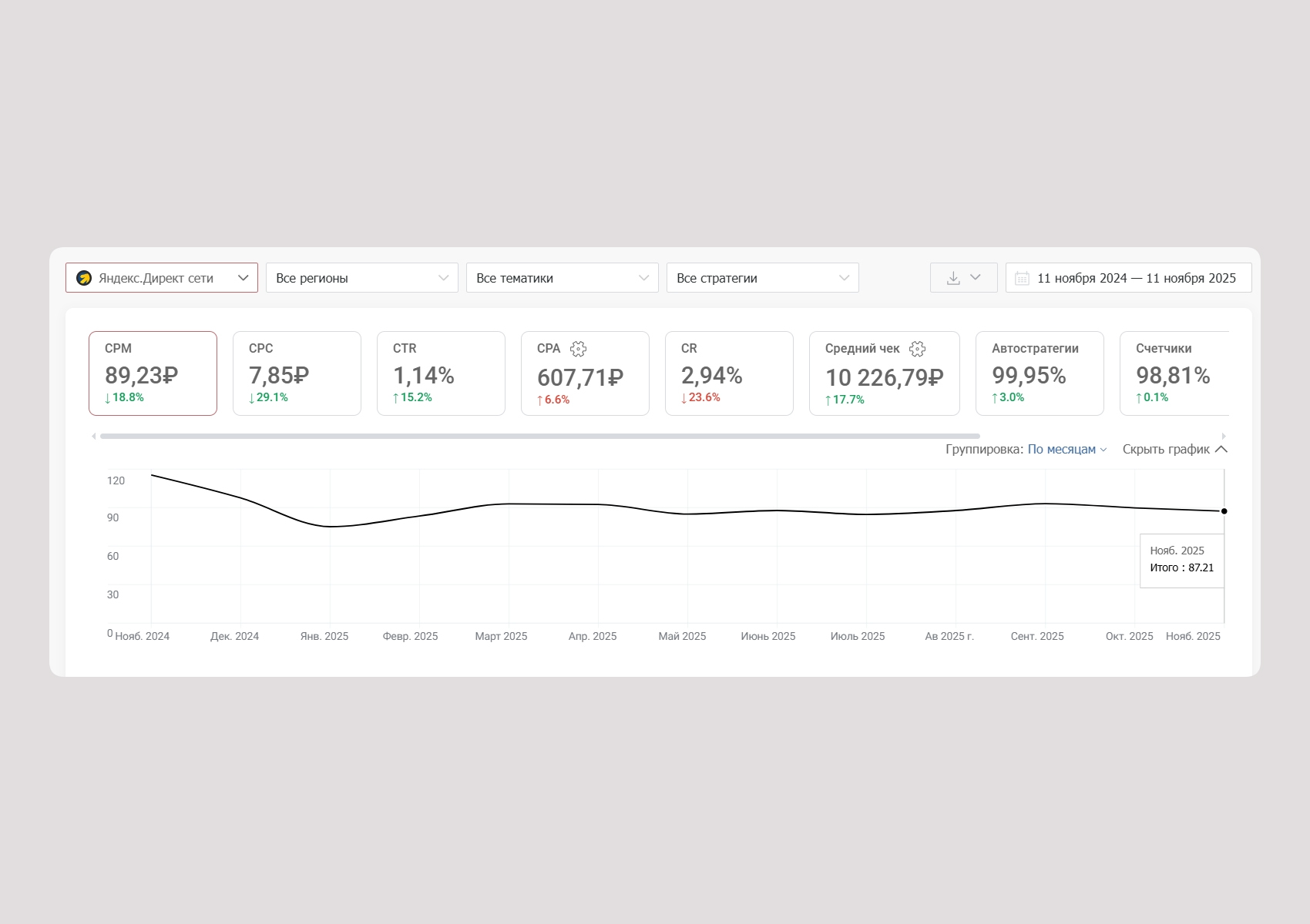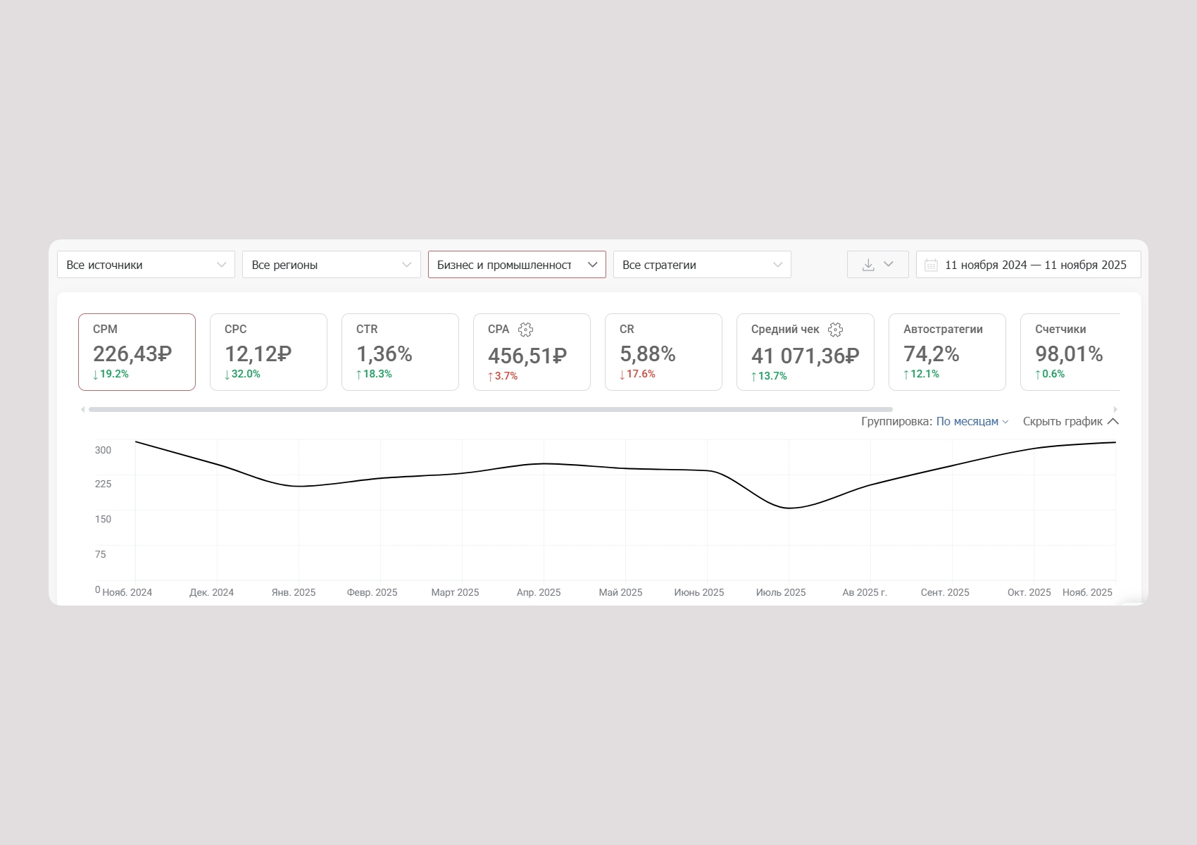 Ситуация усложняется и в разрезе ниш. В «Недвижимости» CPM вырос на 23%, а конверсия упала на четверть. В сегменте «Бизнес и промышленность» ставки увеличились на 19–32%, при этом конверсии снизились почти на 18%. Средний чек растет не так быстро, а дополнительные расходы — логистика, закупки, зарплаты — продолжают увеличиваться.