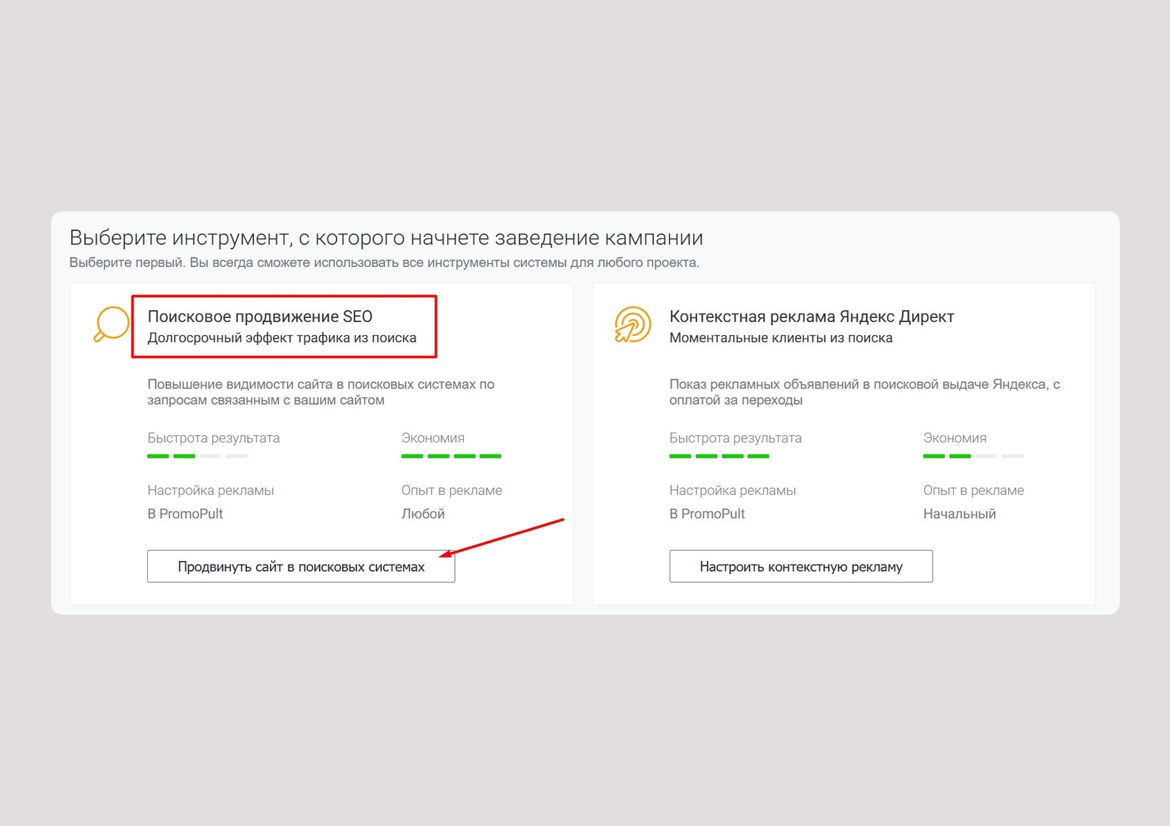 Выберите инструмент «Поисковое продвижение SEO».