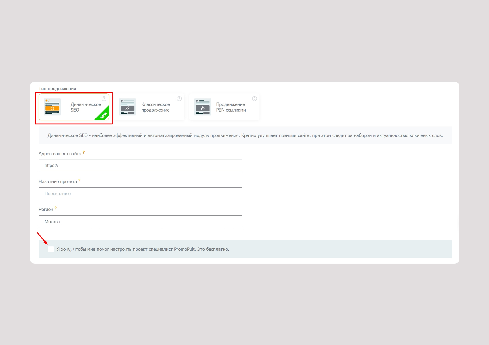 Далее выберите «Динамическое SEO», укажите регион продвижения, адрес сайта и название проекта. Если нужна помощь специалиста при настройке — поставьте галочку, менеджер поможет с запуском. Это бесплатно, нужно только пополнить счет на 3000 ₽ после регистрации — все средства пойдут на продвижение проекта.