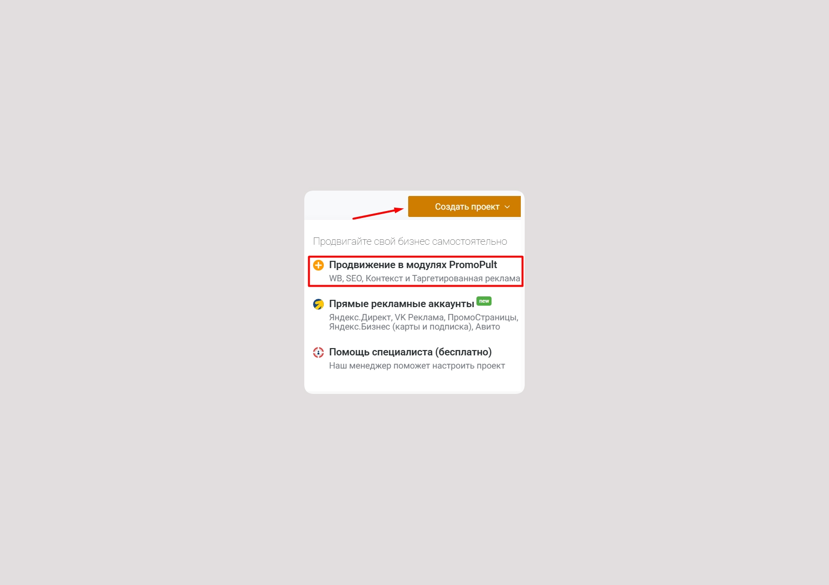 Для запуска продвижения зарегистрируйтесь в PromoPult, нажмите «Создать проект» → «Продвижение в модулях PromoPult».