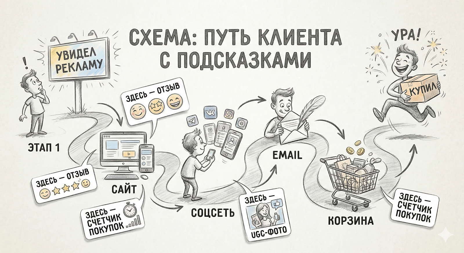 — Социальное доказательство нужно ставить там, где человек сомневается: рядом с ценой, кнопкой, формой, карточкой товара, в письмах и в точке выбора. А не в разделе сайта, который никто не открывает.