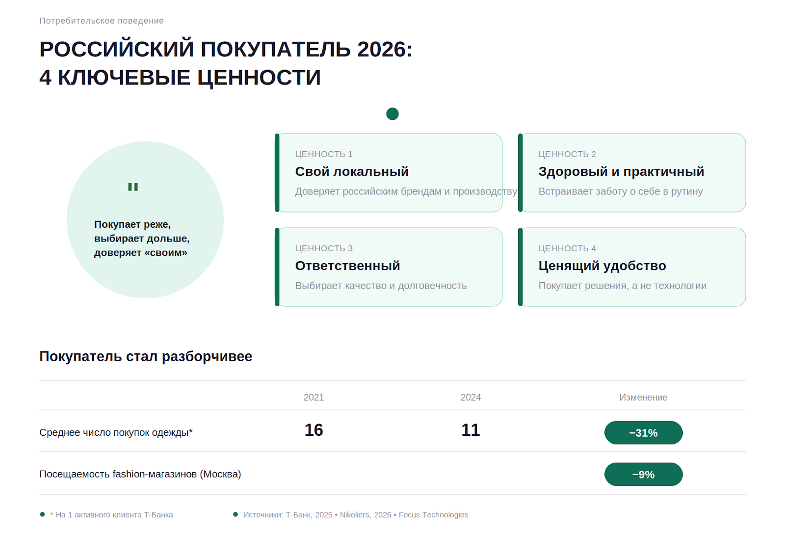 Что это значит для малого бизнеса: гнаться за количеством транзакций — проигрышная стратегия. Выигрывает тот, кто строит доверие. Покупатель 2026 года голосует кошельком за бренды, у которых есть лицо, история и внятная позиция. Безликий товар на маркетплейсе проигрывает бренду с личностью — даже если стоит дешевле.