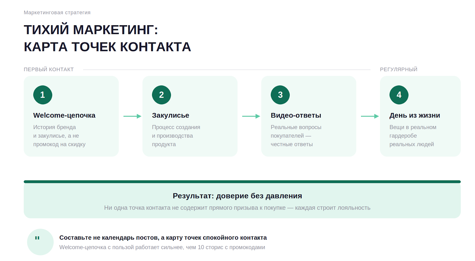 - Тишина продает лучше крика. Замените агрессивный маркетинг на спокойные точки контакта: пользу, закулисье, честные истории. Покупатель устал от давления и выбирает тех, кто не давит.
