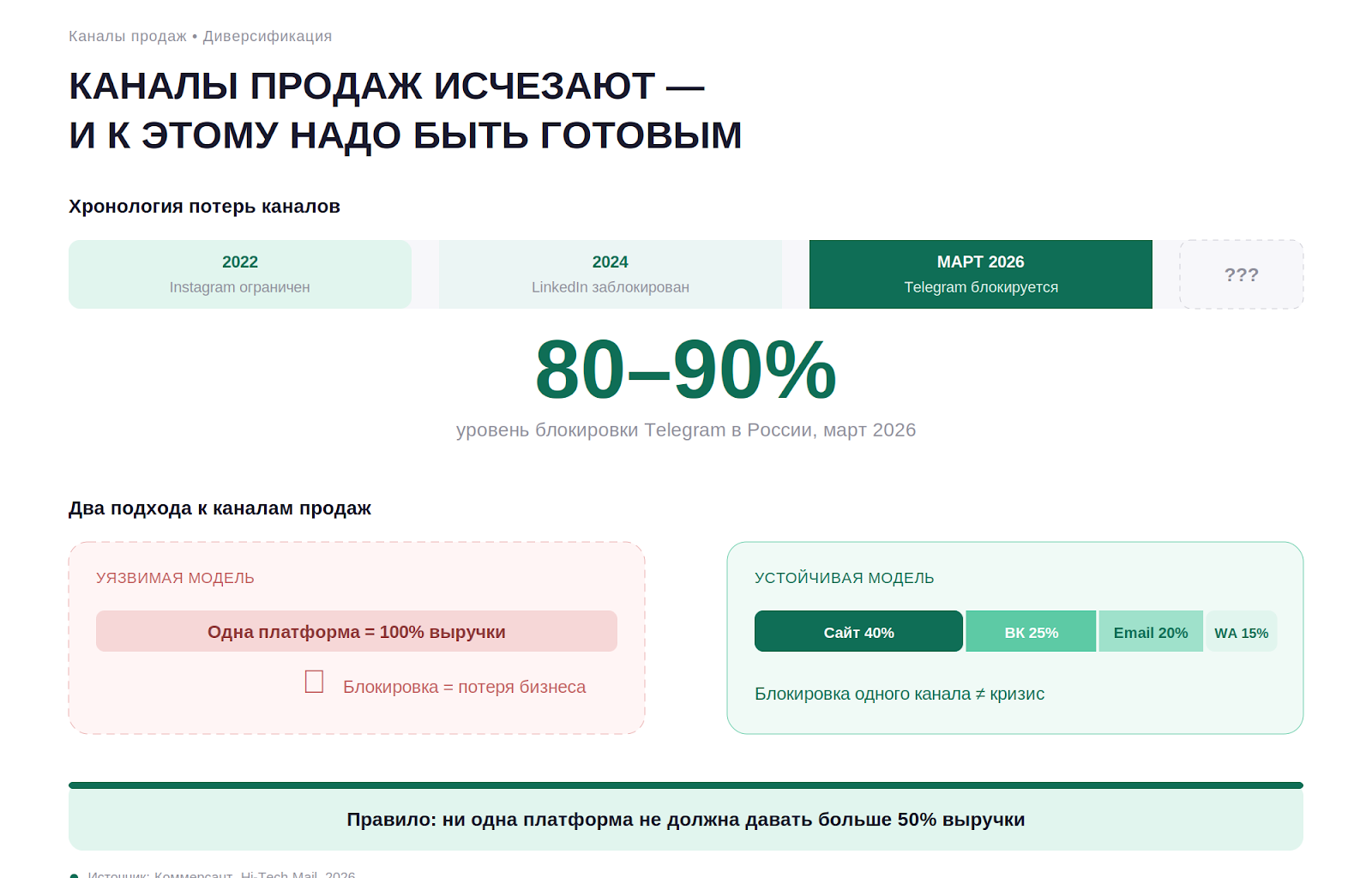 Что это значит для малого бизнеса: диверсифицируйте каналы продаж так, как диверсифицируют инвестиционный портфель. Ни одна платформа не должна давать вам больше 50% выручки. Если у вас сейчас есть только один канал — это не стратегия, это уязвимость. История с Telegram — болезненное, но полезное напоминание.
