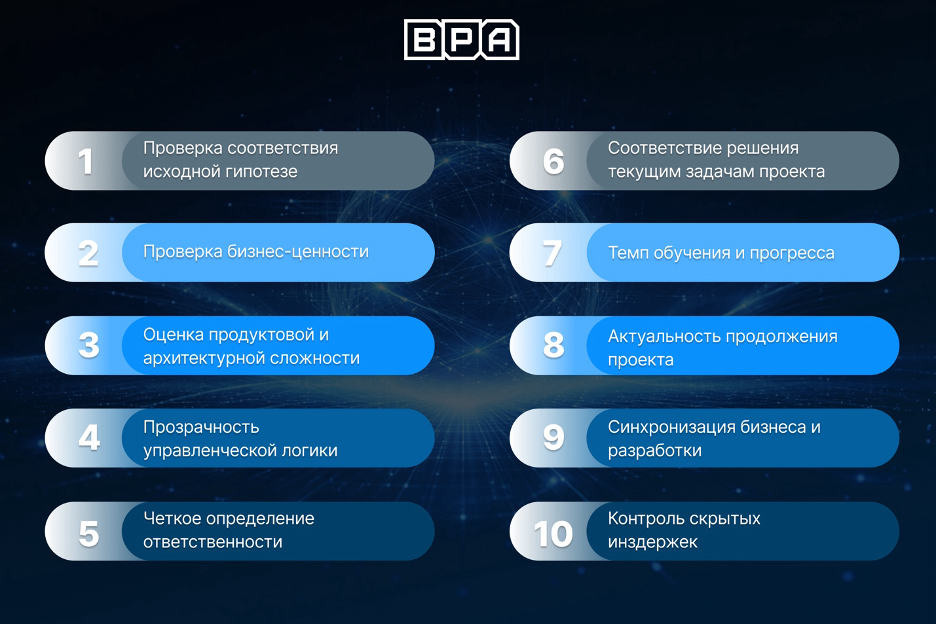 Этот набор критериев помогает взглянуть на проект не только через текущие задачи, но и через его общее состояние. Речь не о формальной проверке, а о регулярной управленческой оценке: насколько проект движется в нужной логике, сохраняет ценность и остается управляемым по мере развития.