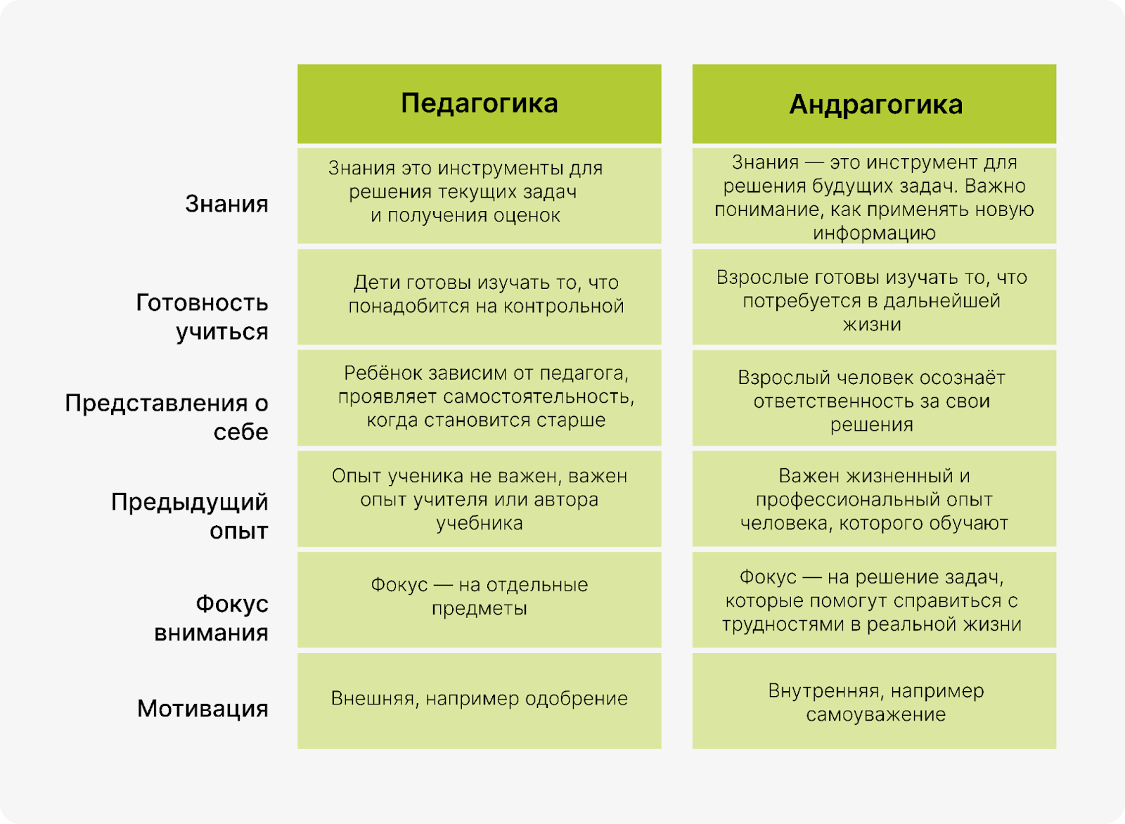 - Андрагогика (обучение взрослых): человек уже имеет опыт, привычки, ценности. Любая новая информация проходит через фильтр: «А как это связано с моим опытом?», «А зачем мне это?», «А подходит ли это под мой стиль работы?».